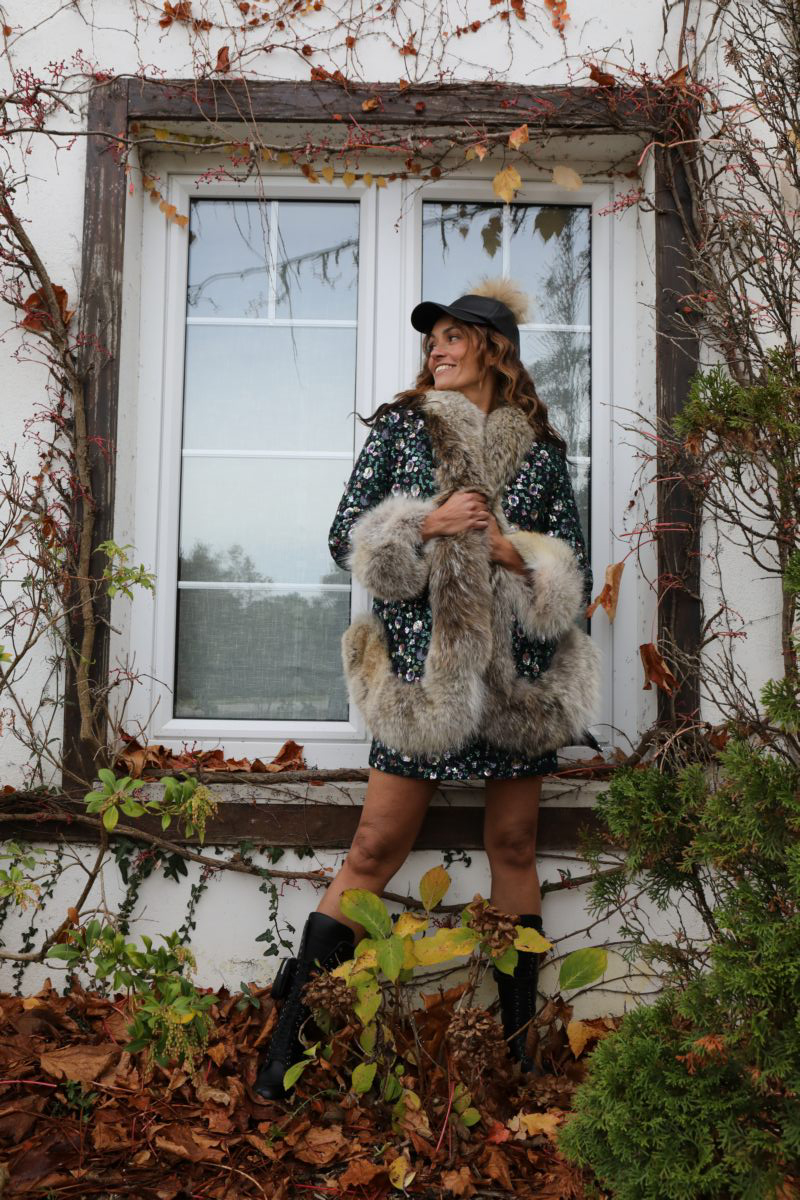 Super chic winter coat made of tulle with flower embroidered in sequins and real coyote fur. Inside padded. Perfect for skirts or dresses. Longer behind than in front.